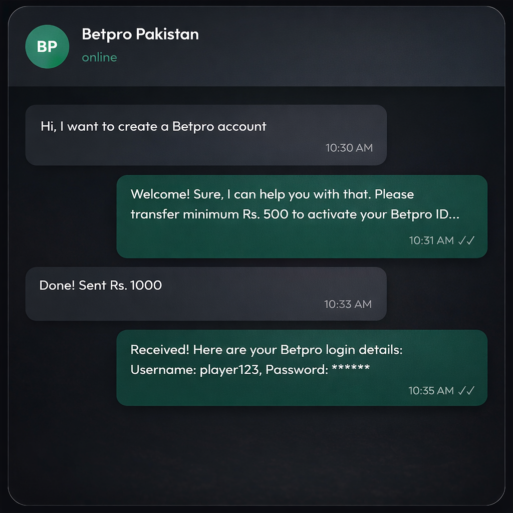 To create a Betpro account in Pakistan: 1) Contact our WhatsApp number, 2) Make a minimum deposit via JazzCash/EasyPaisa, 3) Receive your Betpro ID and password within 2-5 minutes. No app download or registration form required.